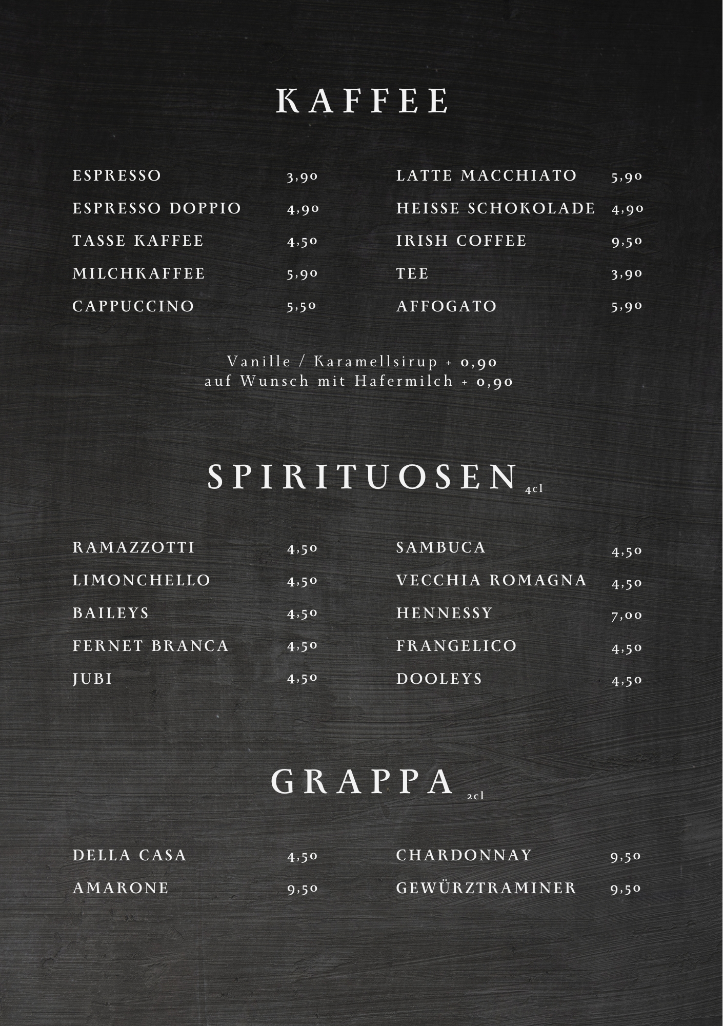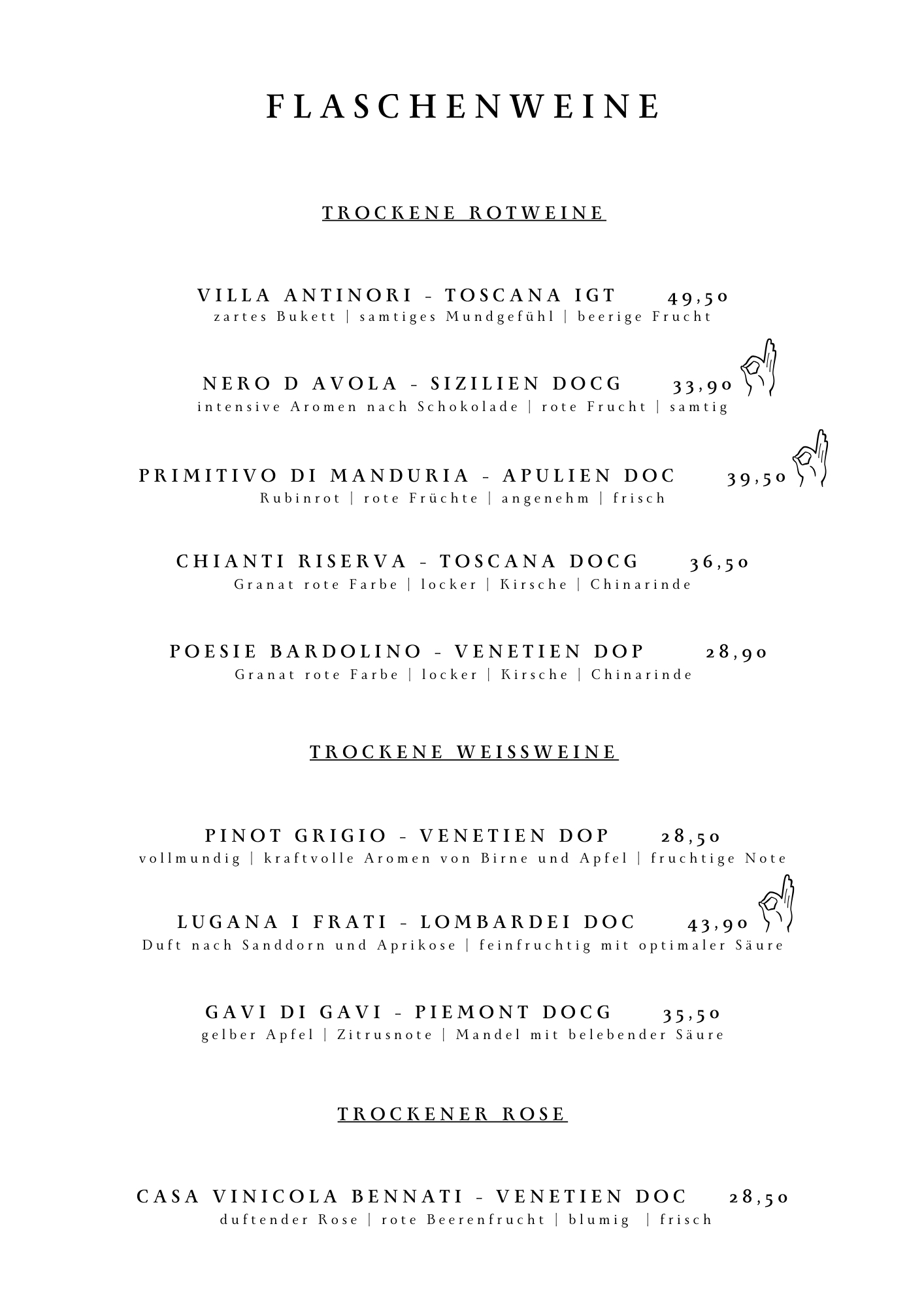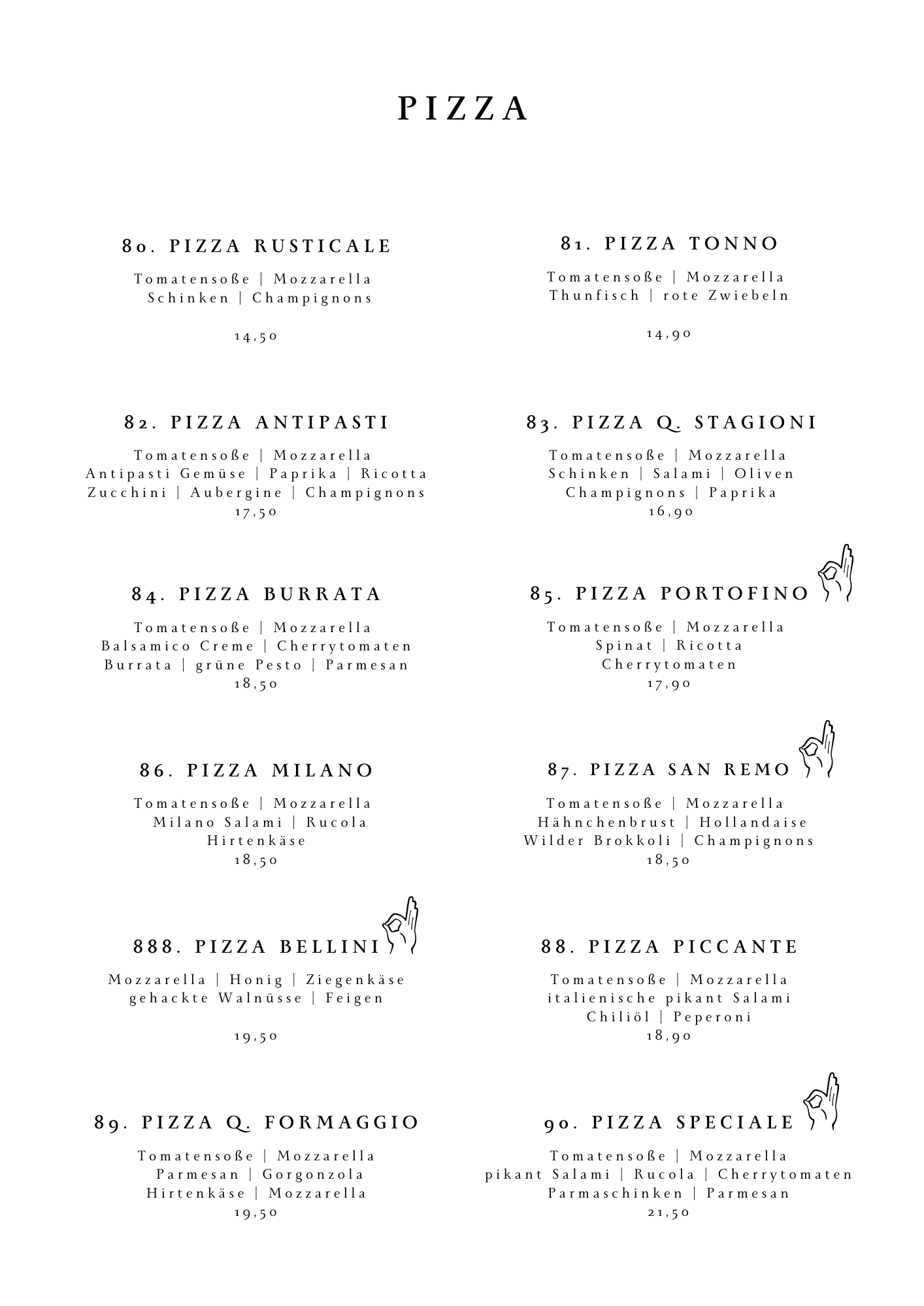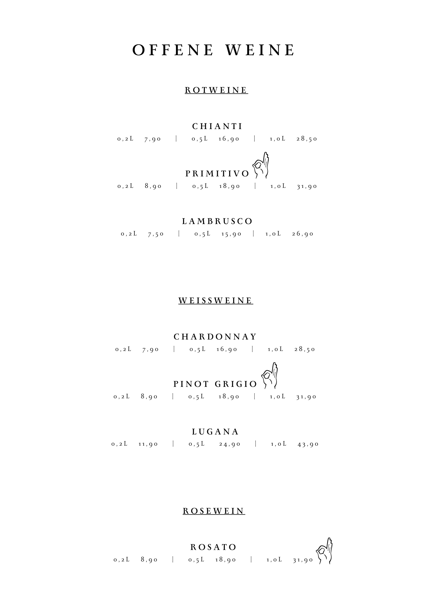 Es erwartet Sie eine Auswahl traditioneller italienischer Spezialitäten – modern interpretiert und mit Liebe zubereitet. Von klassischer Pasta über knusprige Pizza bis hin zu feinen Fleisch- und Fischgerichten: Unsere Speisekarte vereint das Beste Italiens auf einen Blick. Abgerundet mit erlesenen Weinen wird jeder Besuch zum kulinarischen Erlebnis.