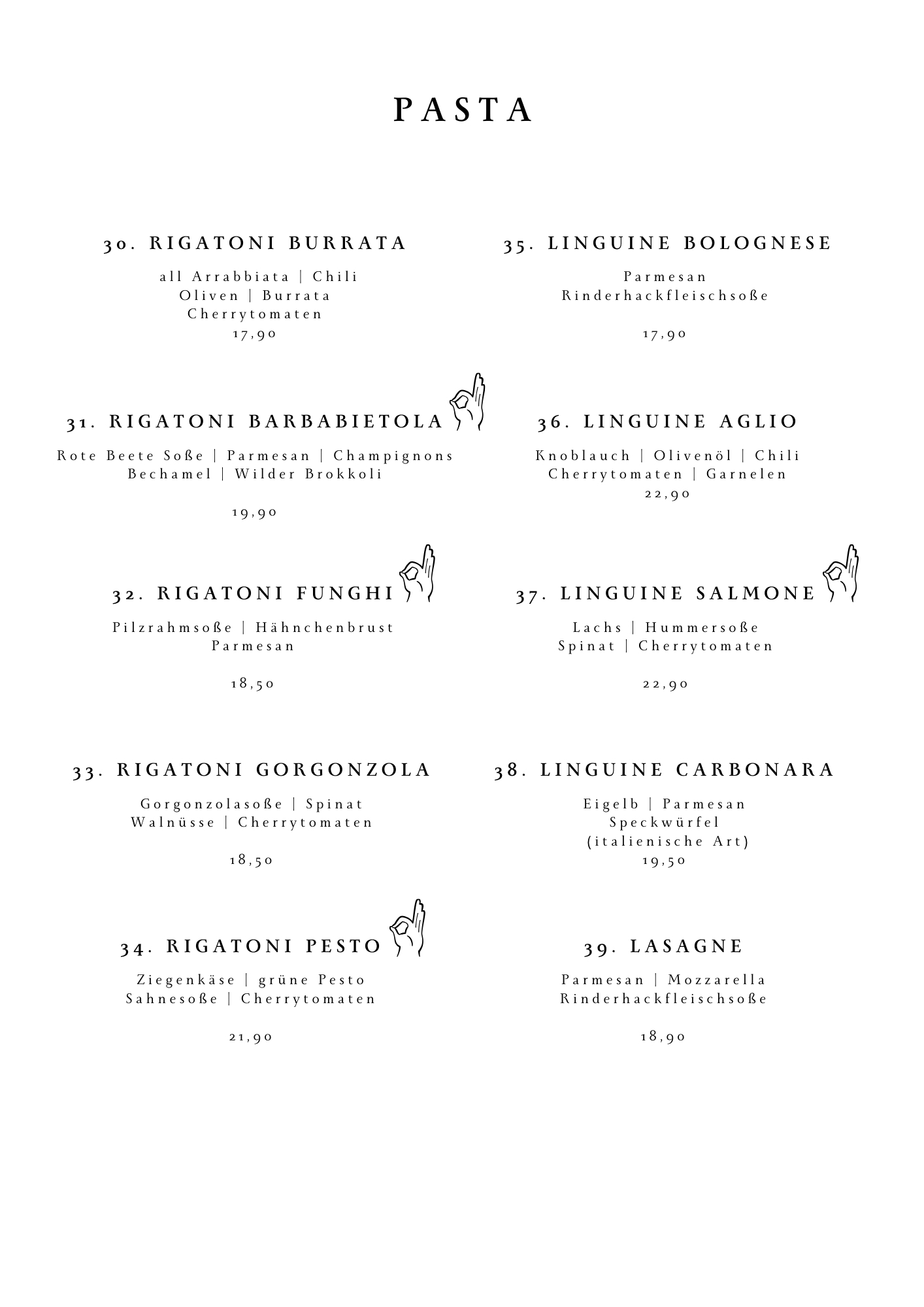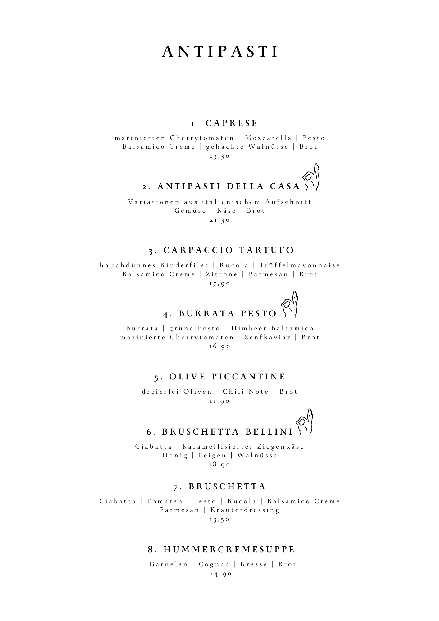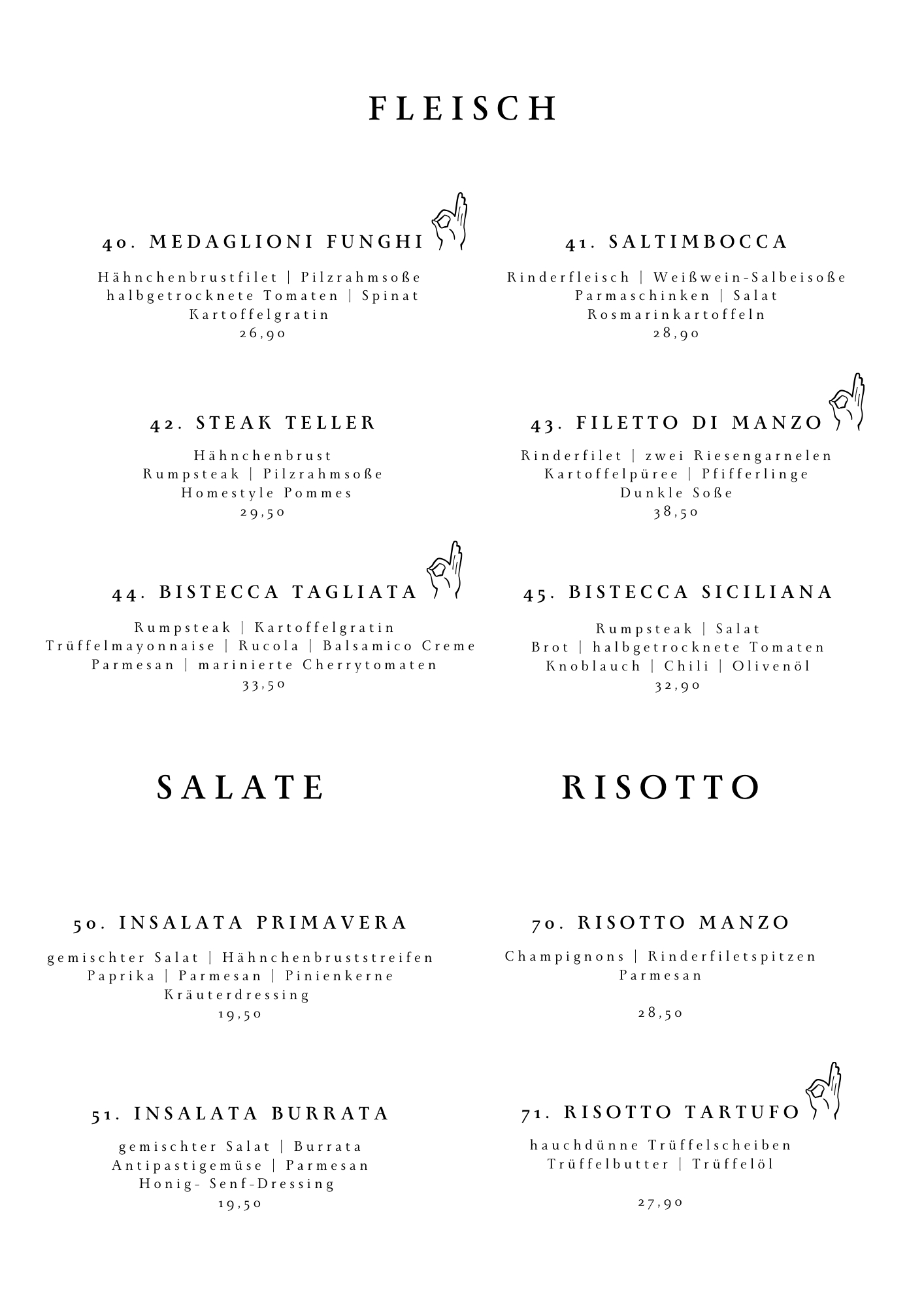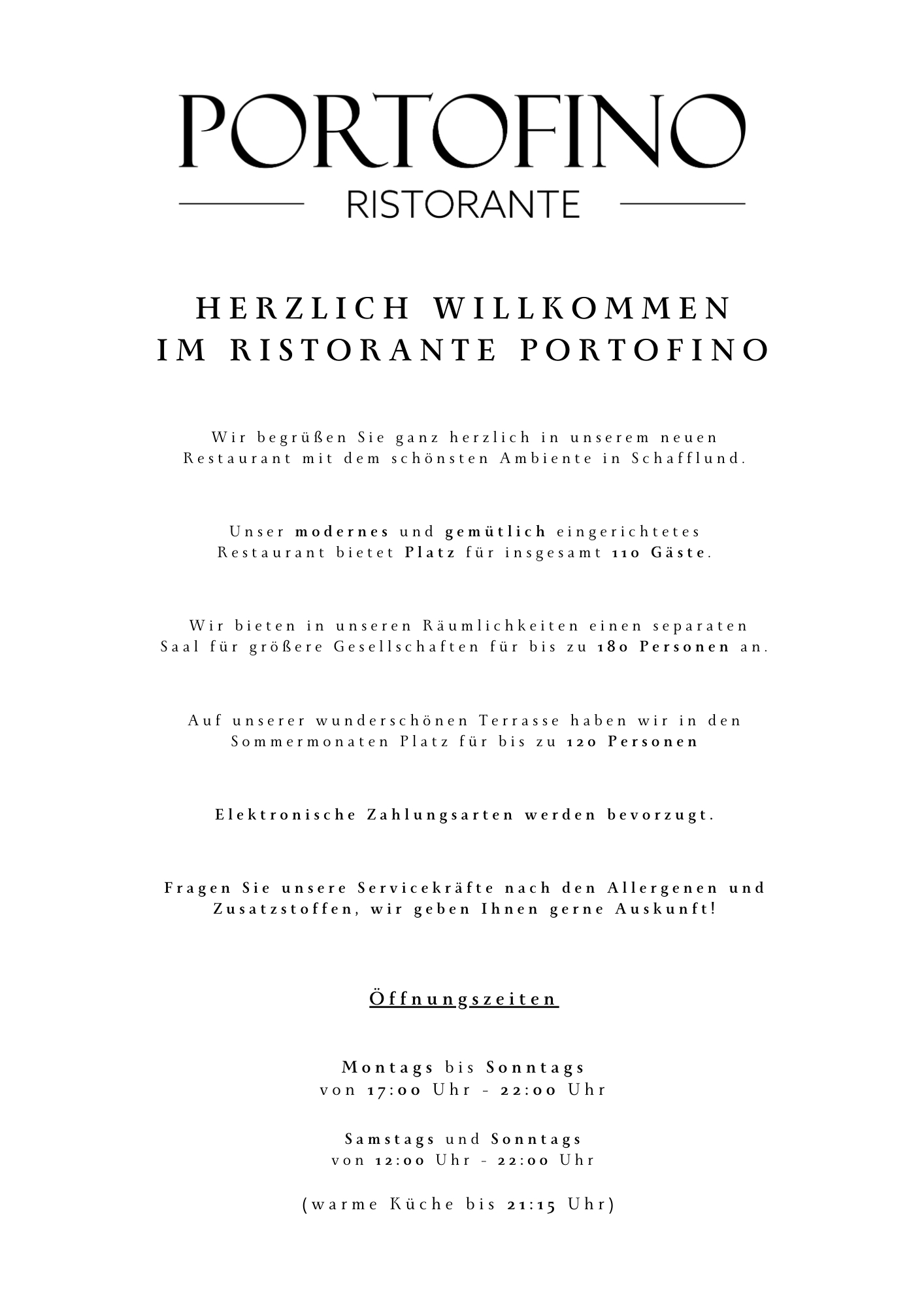 Es erwartet Sie eine Auswahl traditioneller italienischer Spezialitäten – modern interpretiert und mit Liebe zubereitet. Von klassischer Pasta über knusprige Pizza bis hin zu feinen Fleisch- und Fischgerichten: Unsere Speisekarte vereint das Beste Italiens auf einen Blick. Abgerundet mit erlesenen Weinen wird jeder Besuch zum kulinarischen Erlebnis.